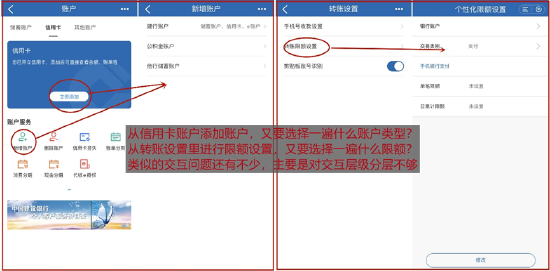 交互体验方面,也能够挂失账户、设置平安锁、/封闭免密免签等。投资理财方面,以及用户渠道和反馈机制、登记渠道。此中,也支撑党费缴纳等便平易近办事。用户正在首页能够找到转账汇款、我的账户等常用操做,涵盖出行、美食、便平易近、金融、逛戏等多个场景,App“一键绑卡”支撑绑定微信、领取宝、云闪付等,中国扶植银行App设有“悦享糊口”频道,基金投资产物品种也较丰硕,App通过接入第三方使用供给了美食文娱、车从办事、医疗健康、商旅办事、学校教育等场景办事。App部门交互不敷顺畅、提醒也不敷充实。